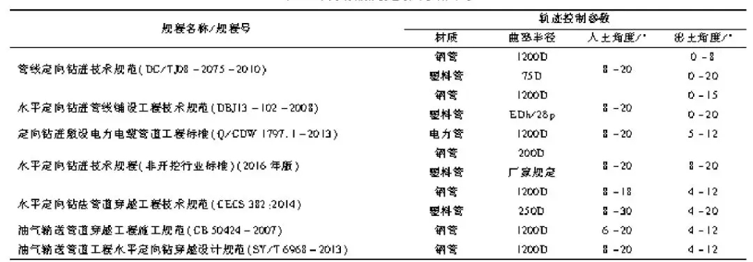 對于定向鉆進,其軌跡控制參數主要包括了曲率半徑、入土角度、出土角度等關鍵參數,而這些參數的取值與管道的材質息息相關,通過對前述7個規程的對比,詳見表2。